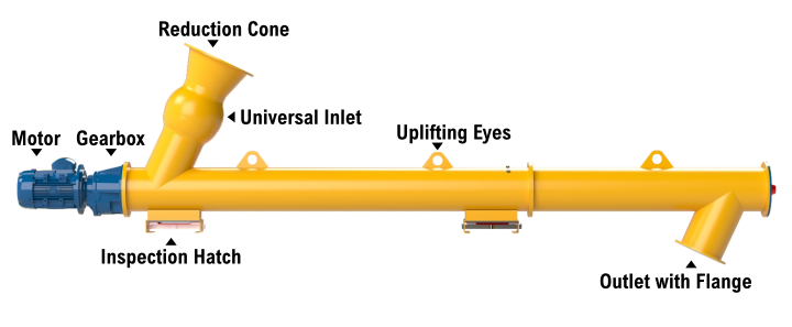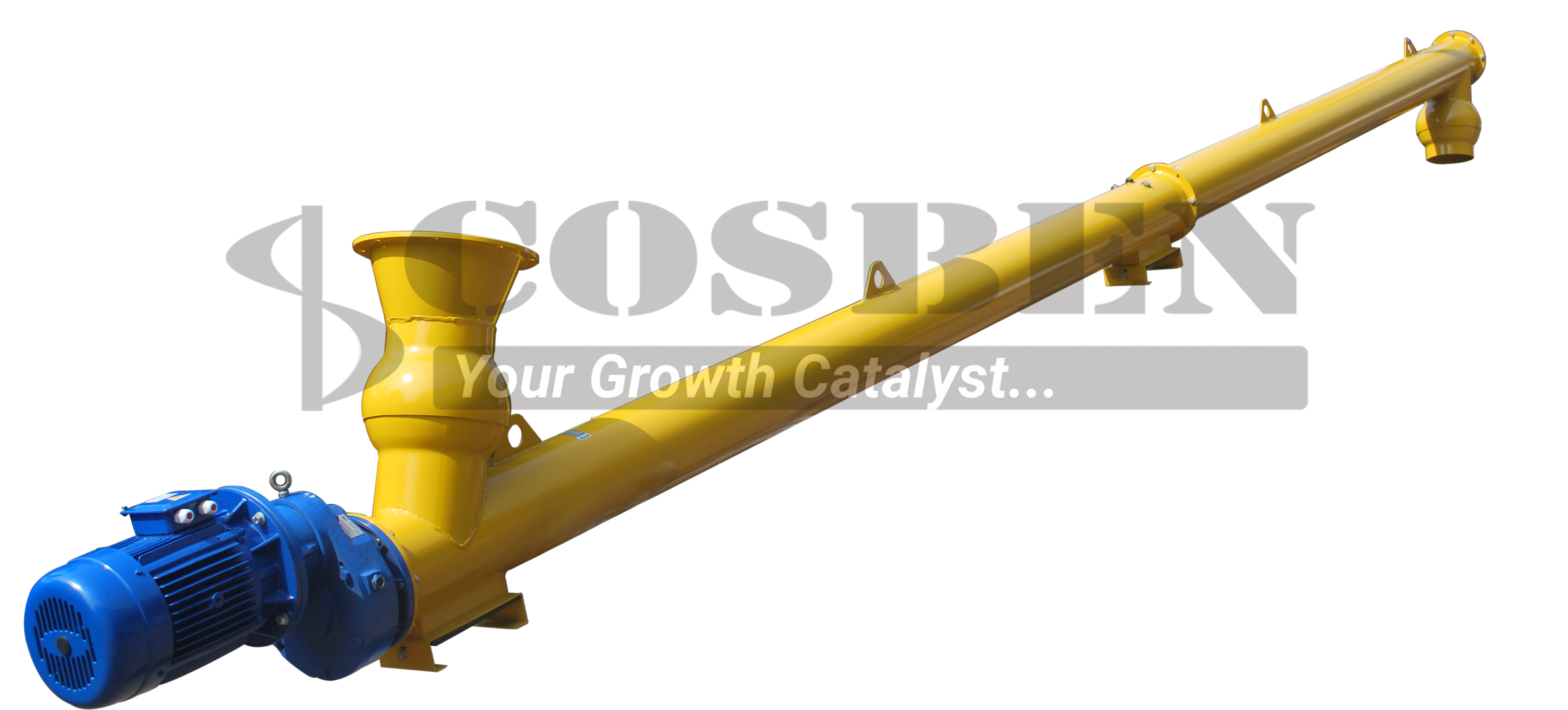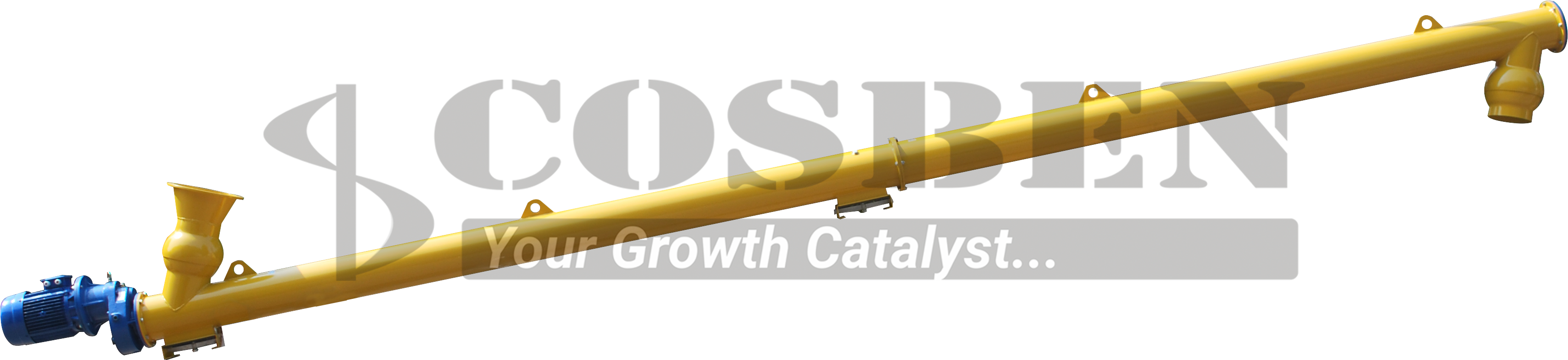 - Continuous flight welded on center pipe with variety of pitch, anti-wear coating (for special applications) choice of cylindrical, rectangular or ball socket type inlet or outlet connections with option of inclination angle adjustable between 0-45 deg and vertical.